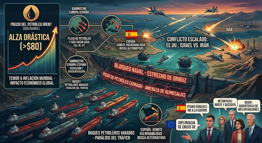 El conflicto en Oriente Medio ha escalado bruscamente: Estados Unidos e Israel han lanzado una ofensiva militar contra Irán, mientras Teherán amenaza con represalias como cerrar el estratégico Estrecho de Ormuz. Este estrecho, angosto paso entre Irán y la península arábiga, canaliza cerca del 20% del petróleo mundial y grandes cantidades de gas. En las últimas jornadas Irán anunció explícitamente que dispararía contra cualquier buque que intentara cruzarlo. Los líderes internacionales reaccionan con cautela: el presidente de EE.UU. justificó el ataque por “una sensación” de ataque iraní, y advierte de más operaciones, mientras el primer ministro israelí lo prometió “decisivo y breve”. España y la UE han condenado el ataque y ampliado la diplomacia de crisis: Pedro Sánchez afirmó “no a la guerra” al rechazar el uso de bases españolas para atacar Irán, generando tensión con la Casa Blanca que amenazó con sanciones comerciales.